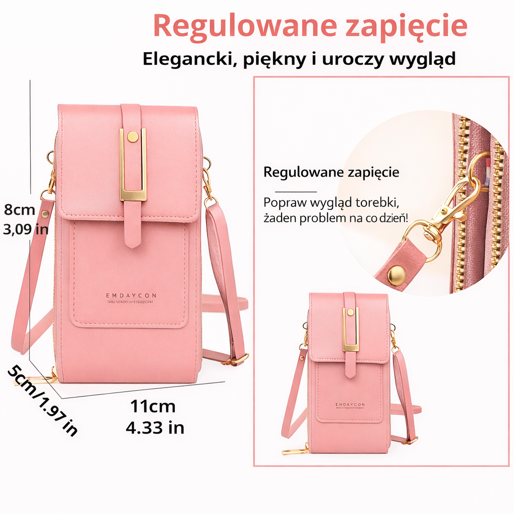 • Poręczny format: Zorganizowane miejsce na smartfon, karty, gotówkę i drobiazgi.