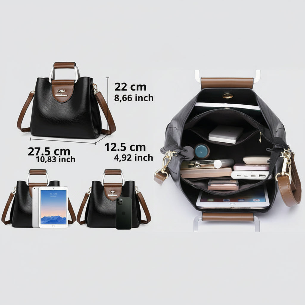 Kompaktowa i elegancka torebka na ramię, która łączy porządne wykonanie z praktycznym układem kieszeni. Sztywna forma trzyma kształt, a gładkie wykończenie i metalowe detale dodają klasy na co dzień i na wyjścia.
